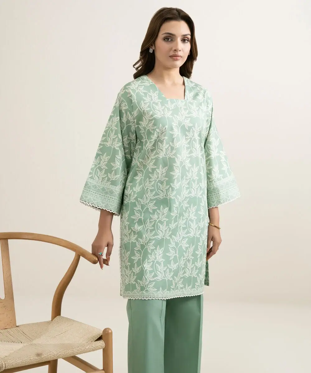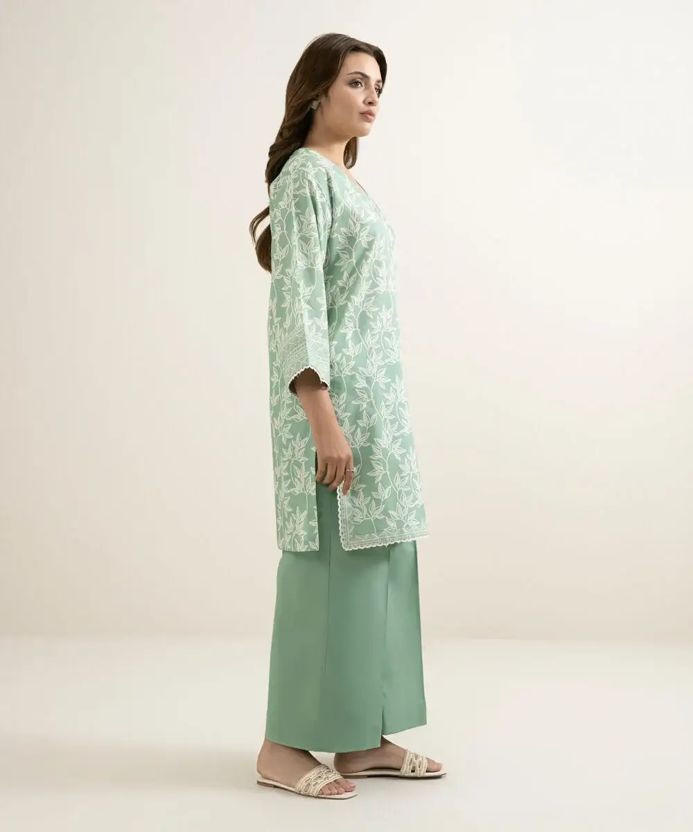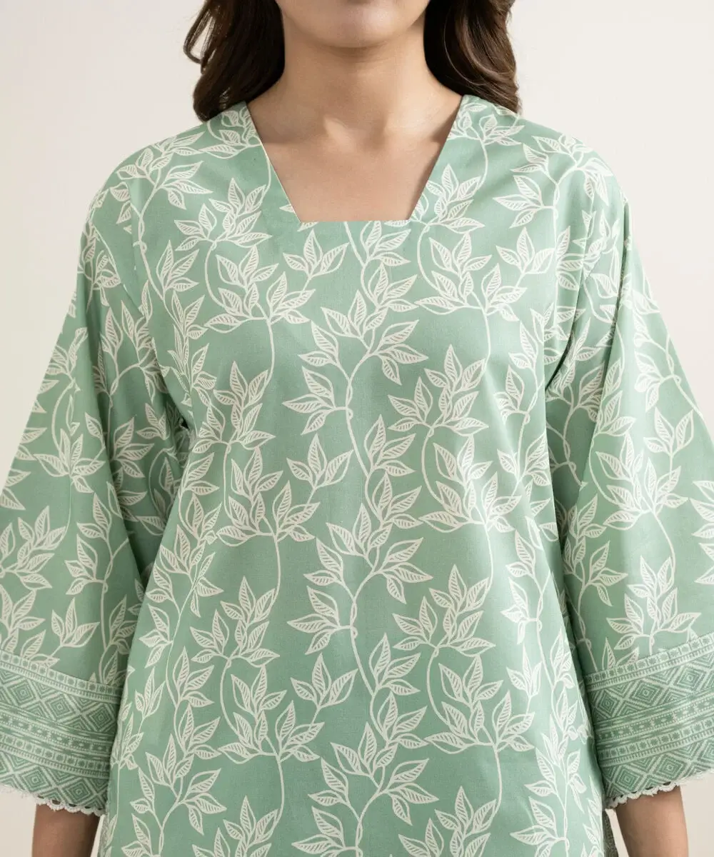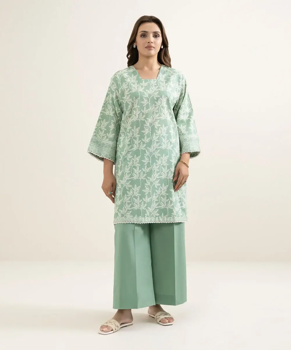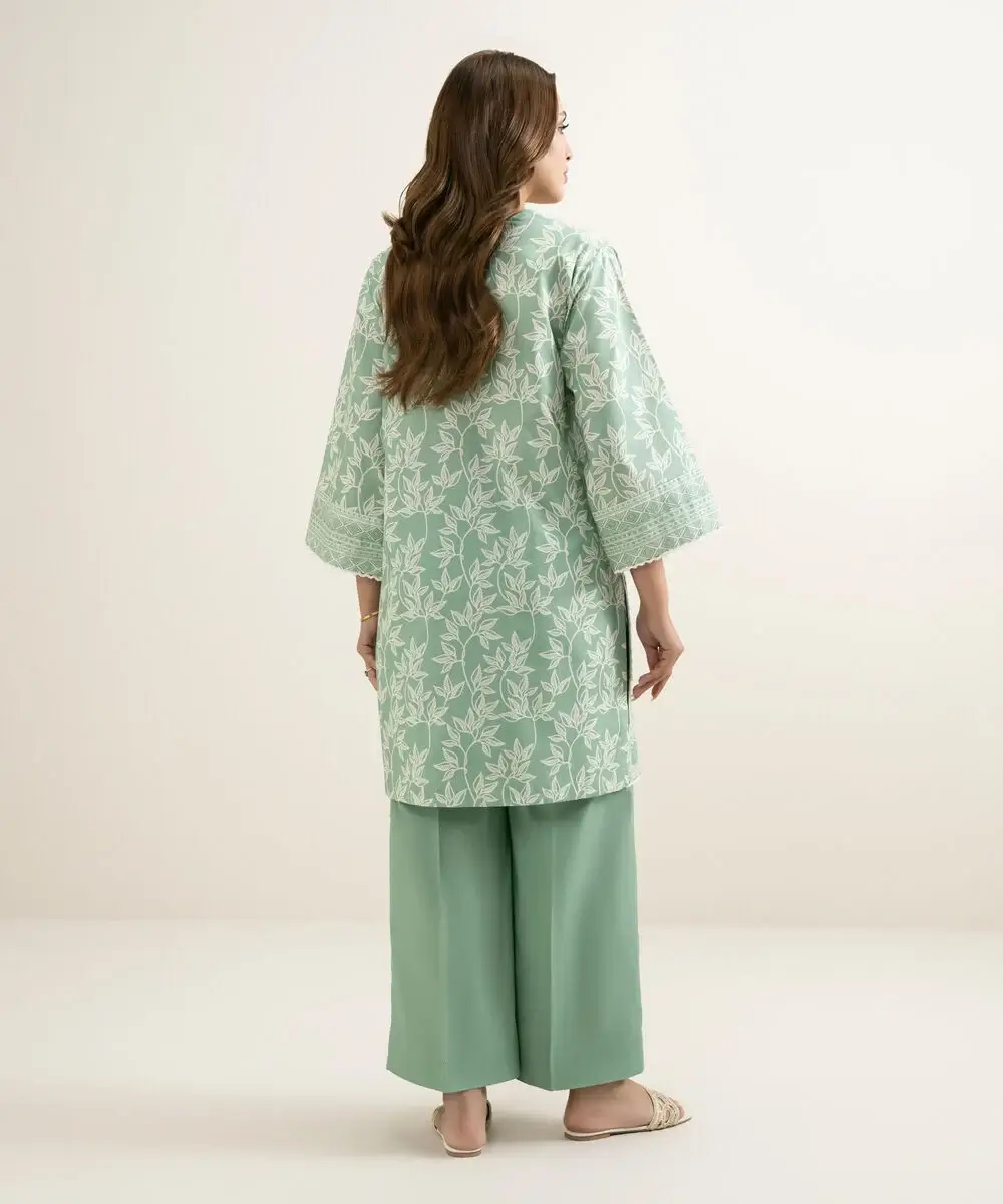 Elevate your style with our two-piece printed pink ensemble featuring a lawn shirt paired with cotton trousers.