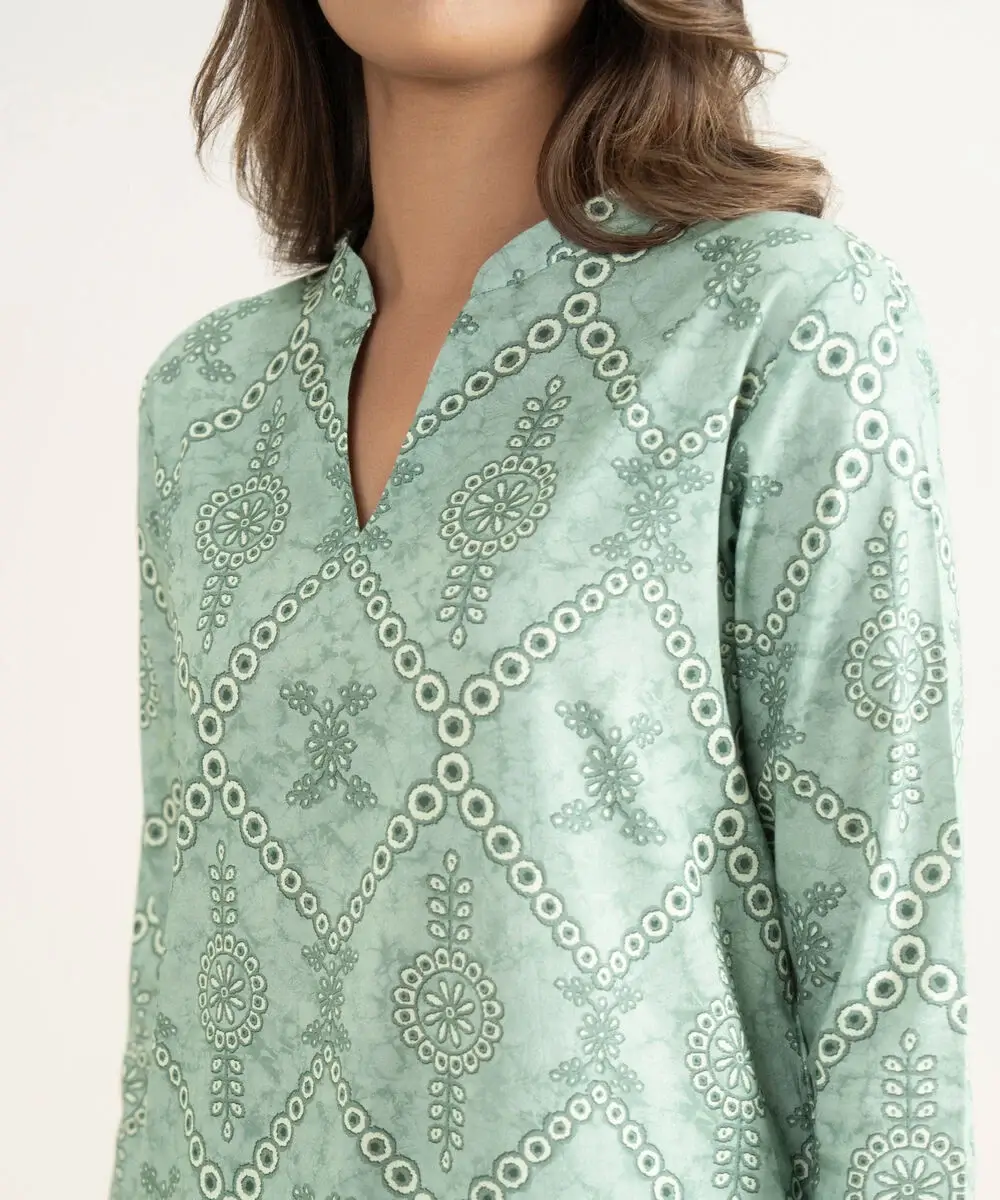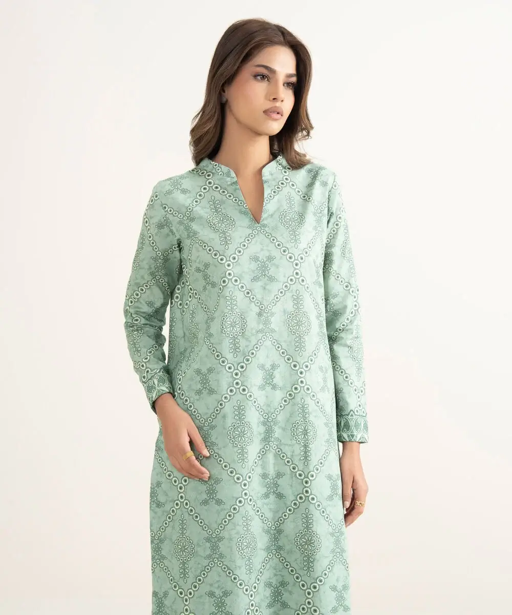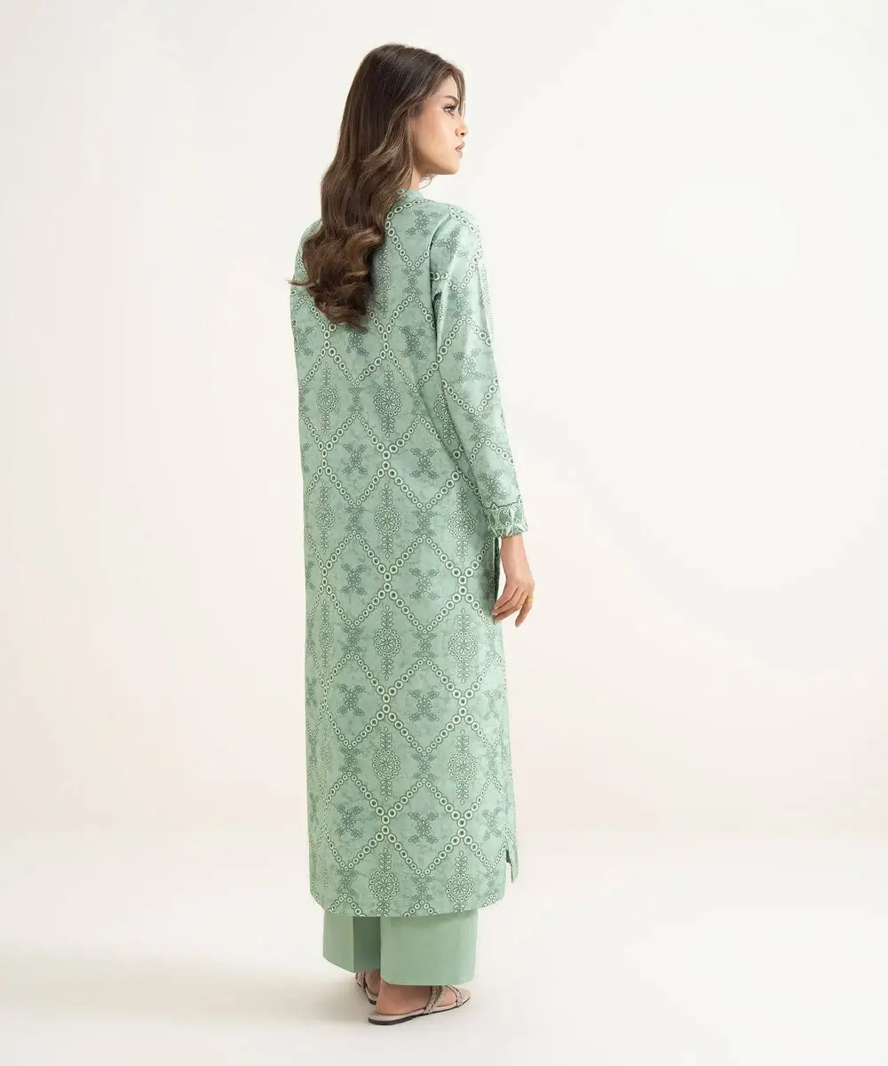 Make a statement with our two-piece printed moss green ensemble featuring a lawn shirt paired with cotton trousers.