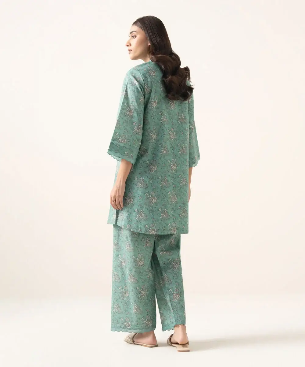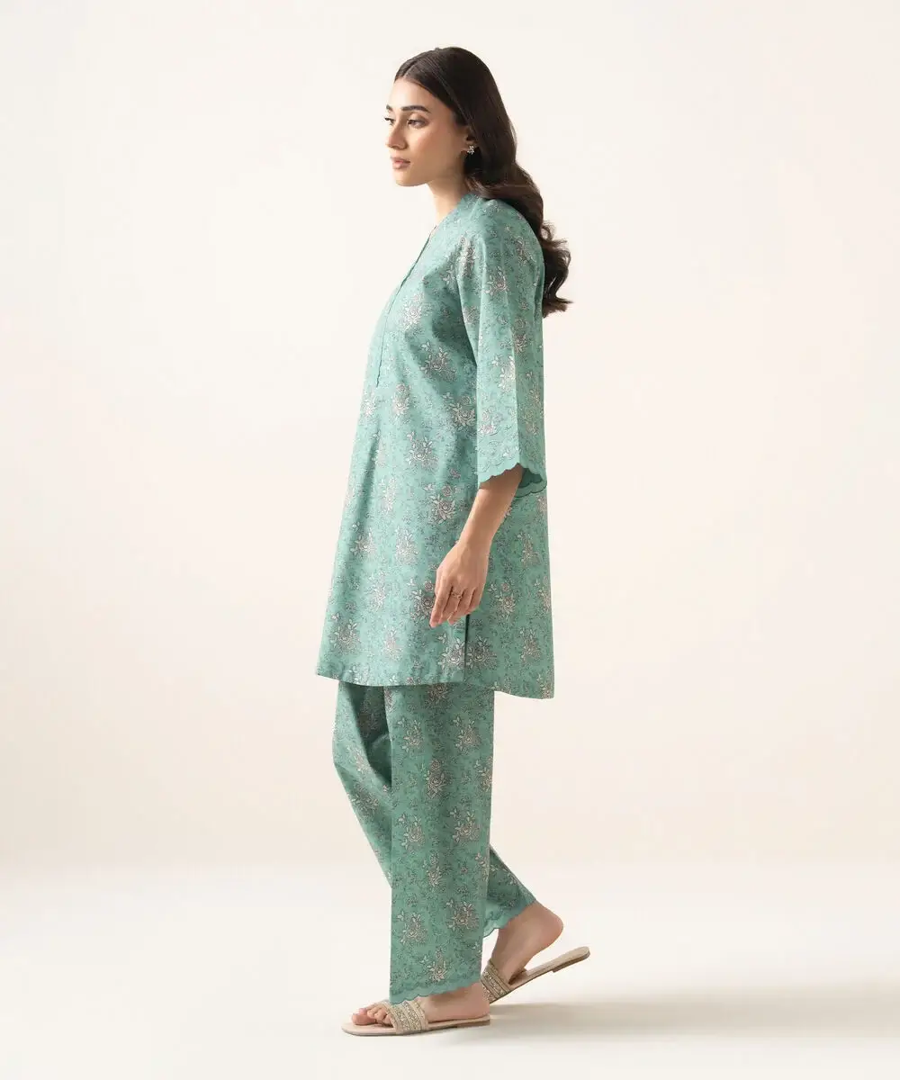 Make a statement with our two-piece printed light aqua ensemble featuring a lawn shirt paired with cotton trousers.