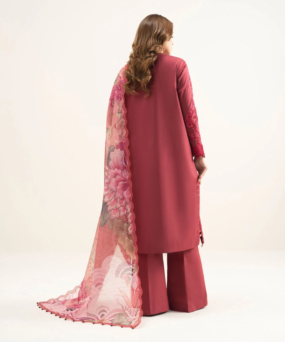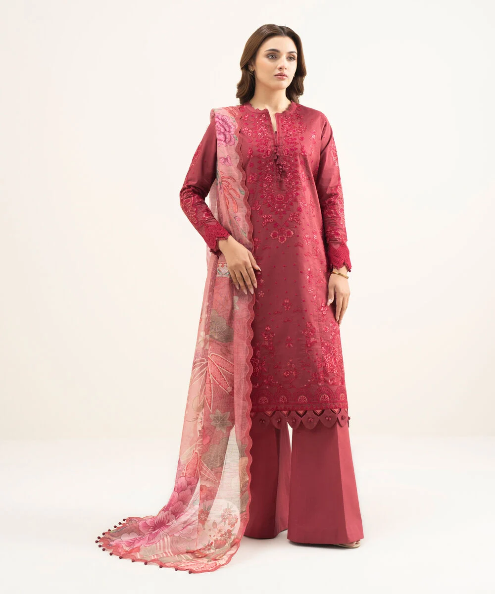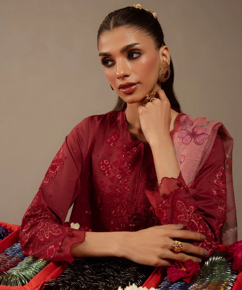 Make a statement with our three-piece embroidered red ensemble featuring a textured lawn shirt paired with a mannar dupatta and cotton trousers.