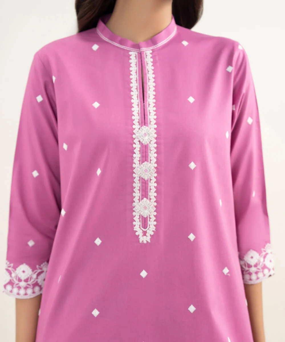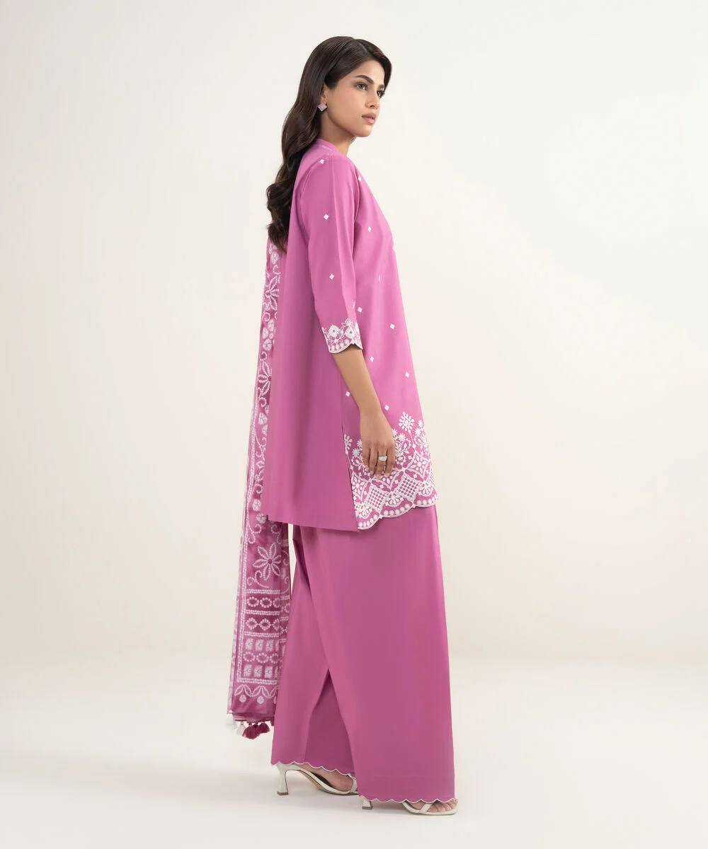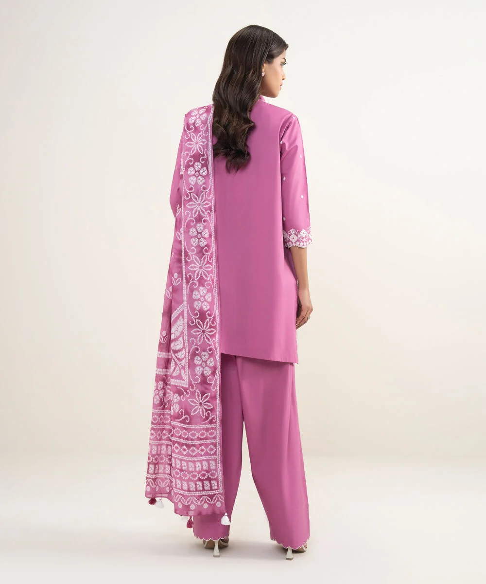 Make a statement with our three-piece embroidered pink ensemble featuring a lawn shirt paired with a voile dupatta and cotton trousers.